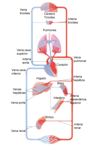 Circulación mayor: es el recorrido que efectúa la sangre oxigenada (representada con color rojo) que sale del ventrículo izquierdo del corazón y que, por la arteria aorta llega a todas las células del cuerpo, donde se realiza el intercambio gaseoso celular o tisular: deja el O2 que transporta y se carga con el dióxido de carbono, por lo que se convierte en sangre carboxigenada (representada con color azul). Esta sangre con CO2 regresa por las venas cavas superior e inferior a la aurícula derecha del corazón.